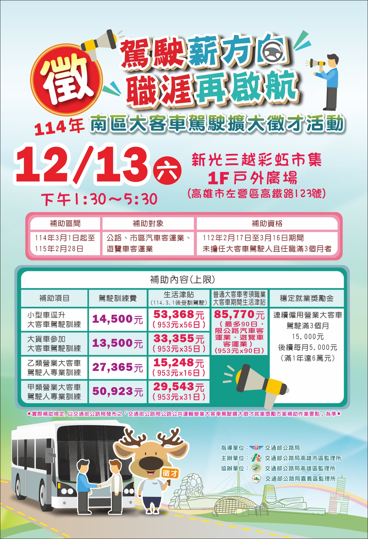 多項補助等你拿!114年南區大客車駕駛擴大徵才活動,