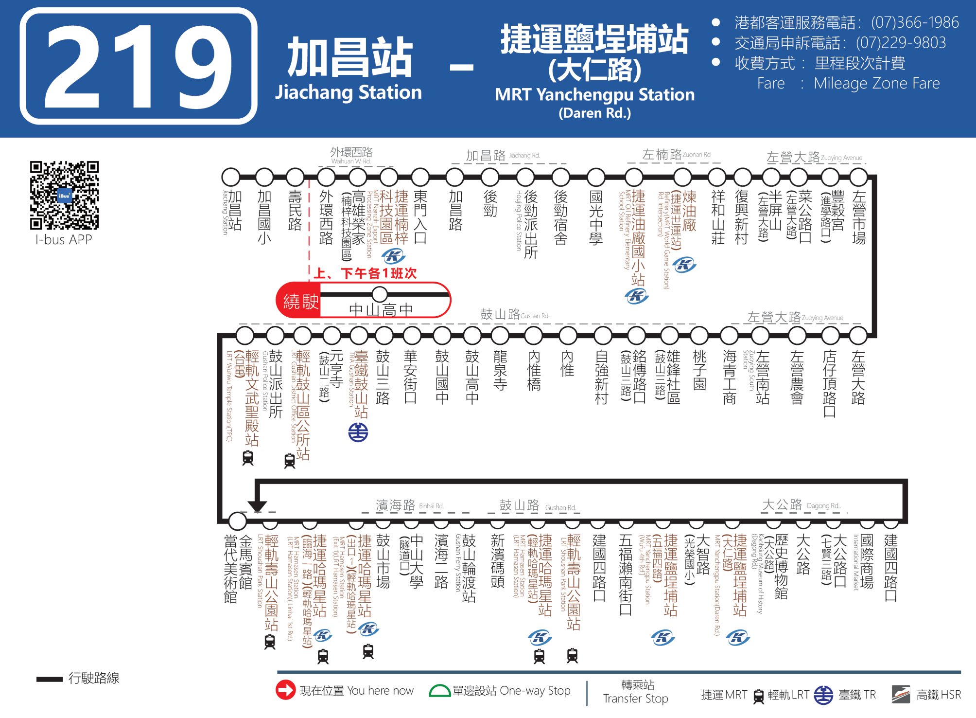 115年01月24日起,56C 路停止行駛,臺鐵鼓山站的乘客 去程 可利用219路於 輕軌鼓山區公所站 下車後於鼓山行政中心(興隆)轉乘56AB前往,返程